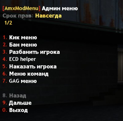 Админ-меню: Вызывается стандартной командой amxmodmenu. Предназначено для быстрого доступа к функциям управления (бан, кик, смена карты и т.д.).
