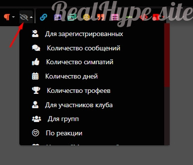 Хайд - ограничение просмотра части сообщения по критериям. Вы можете посмотреть способы сокрытия содержимого нажав на зачеркнутый глаз в редакторе.Почему мою тему удалили?