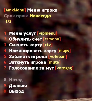 Админ-меню: Вызывается стандартной командой amxmodmenu. Предназначено для быстрого доступа к функциям управления (бан, кик, смена карты и т.д.).