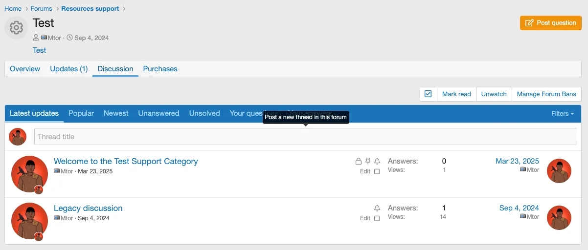 - Оптимизированные для поддержки, позволяют пользователям создавать различные типы тем в форумах ресурсов (например, запросы функций, общие обсуждения, статьи).