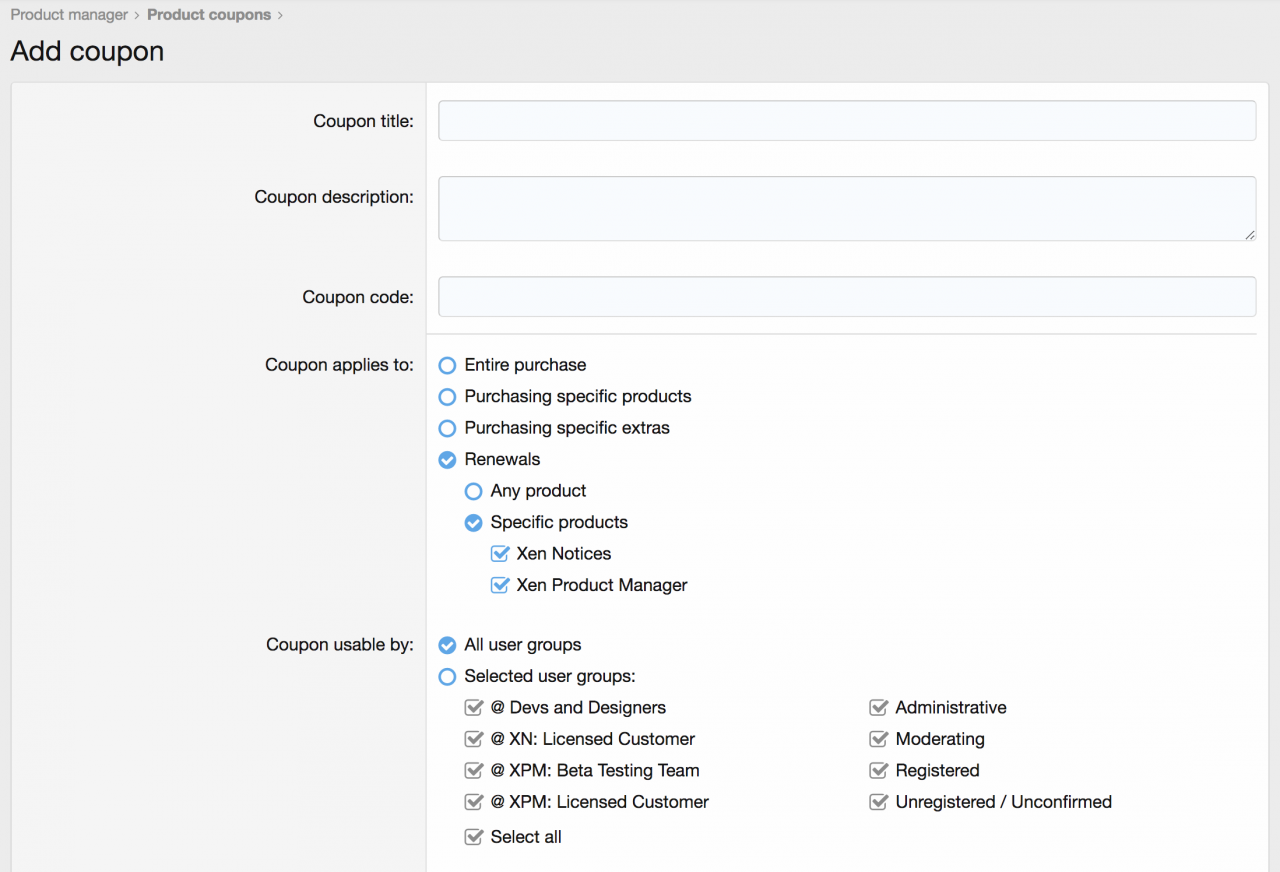 - Группам пользователей, которым автоматически выдается купон без необходимости добавлять его вручную