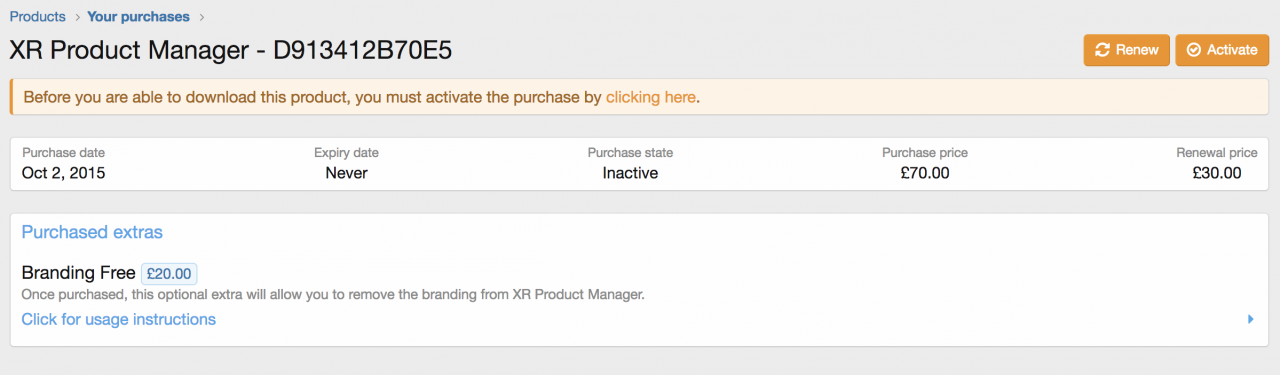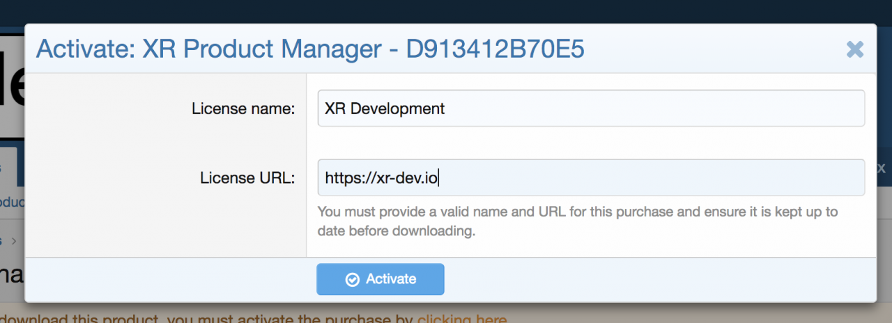 При первой покупке продукта он либо "Активен", либо "Неактивен" в зависимости от параметров, выбранных при создании продукта. Чтобы активировать покупку, все, что нужно сделать, это нажать на покупку и кнопку "Активировать". Откроется оверлей, в котором можно ввести имя и URL-адрес. После предоставления этой информации покупка становится "активной", и продукт теперь можно загружать. Лицензированные клиенты не могут загружать файлы для неактивной покупки.